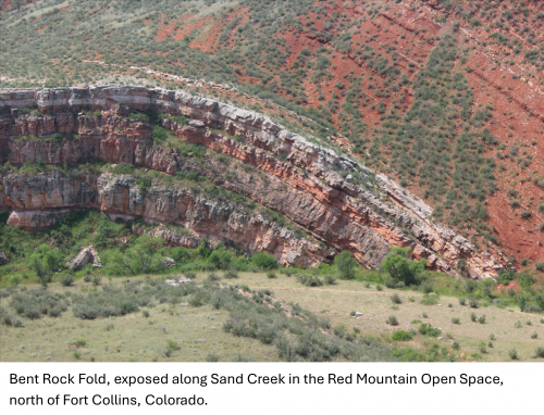 Participants will meet at Me Oh My Coffee and Pie shop in Laporte, CO (3310 W County Road 54g, Laporte, CO) to top off coffee and restroom use. The first field trip stop will be just north of Horsetooth damn near Bellevue along the irrigation ditch. This will be an overview stop of the regional Permian (Wolfcampian – Leonardian) geology and up close with compound dune deposits in the Lyons Sandstone. The second stop will be along Hwy 287 near Livermore CO. A classic road cut of the Ingleside marine to continental depositional cycles. The third stop will be an examination of a sandy interdune/sand sheet complex of the Lyons Sandstone along CR80 and the fourth and final stop will be at Red Mt. open space. This stop will involve a relatively flat hike of approx. 2 miles to examine the Ingleside cycles, two Lyons sandstone beds, the overlying Blaine anhydrite and the Salt Creek anticline. We will be back at the cars by 4:00 for the ~2 hour drive back to Denver.